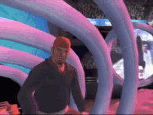 Fred Durst appears as a character in a WWE Smackdown video game, standing in front of a purple and blue display.