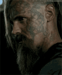 Halfdan from Vikings, with his distinctive beard, long hair, and face tattoo, captured in an intense moment.