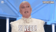 Viperissima from Tale e Quale Show dramatically exclaims 'Si Vede!' on Rai 1 HD with an elf-like appearance.