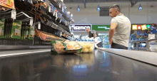 Nikita Petryaev shopping at a supermarket, placing items on the conveyor belt.