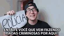 A man from Operação Cinema holds a 'POLÍCIA' sign, questioning someone about making criminal jokes.