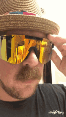 A man with a mustache and straw hat takes off his reflective sunglasses, revealing a surprised expression.