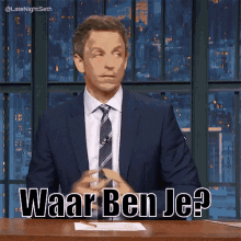 Seth Meyers, a man in a suit and tie, looks around with a curious expression, as the Dutch text 'Waar Ben Je?' appears on screen.