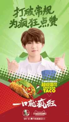 Wang Yuan (Roy Wang) winks and gives a thumbs up, promoting the new KFC Chicken Taco.