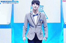 Bae Jin Young from Wanna One striking a cute pose on stage during a ranking announcement.