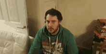 A man with a beard and green hoodie reacts with a shocked expression, eyes wide open.
