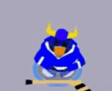 A blue penguin from Water Vikings Wv, wearing horns and holding a hockey stick, points forward.