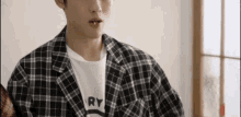 A member of WayV, a young man, is seen eating a candy bar while wearing a plaid jacket and white t-shirt.