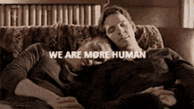 Hal, Alex, and Tom cuddling on a couch with the text 'We Are More Human' displayed.