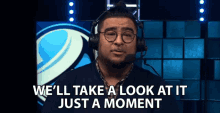 A man wearing headphones and a microphone says, "We'll take a look at it just a moment," while staring intently.