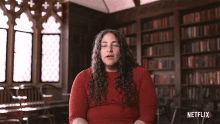 A woman in a red shirt speaks in a library, with the question 'What Are They Thinking?' on screen.