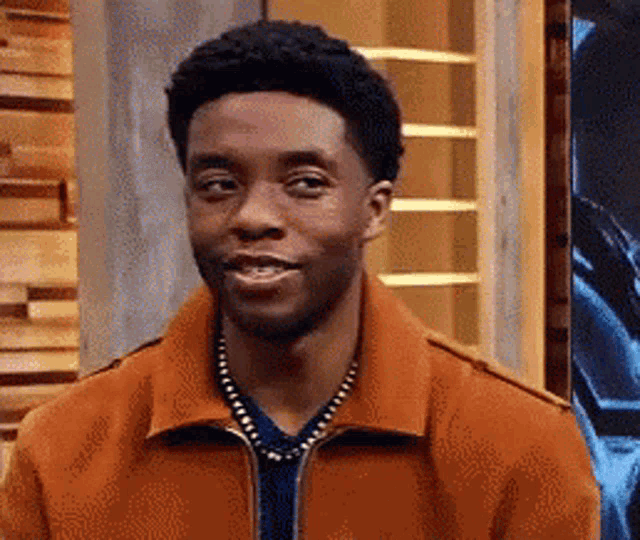 A man in an orange jacket and beaded necklace reacts with a confused smile, asking 'What?'