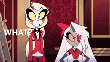 Charlie Morningstar and Vaggie from Hazbin Hotel react with a surprised 'WHAT?'