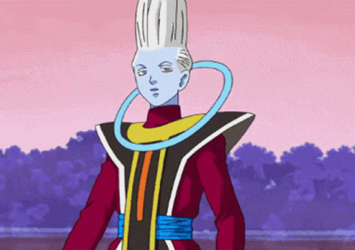 Whis, the angelic attendant, performs a distinct hand gesture, showcasing his calm demeanor.