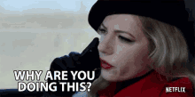 Katheryn Winnick on a phone call, looking annoyed and asking 'Why are you doing this?'