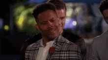 Wills' confused expression while holding a rose on The Bachelorette, wearing a plaid suit.