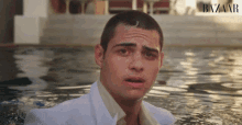 Noah Centineo in a white jacket, giving a seductive wink while in a pool for Harpers Bazaar.