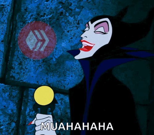 The Witch Queen Maleficent lets out an evil 'Muahaha' laugh, holding a microphone.