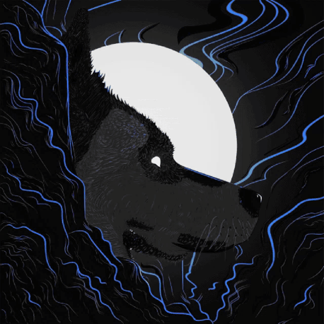 A captivating animated illustration of a wolf's profile against a glowing yellow moon, surrounded by mystical blue lines.