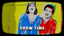Judy Garland and Barbra Streisand in a vibrant, retro 'SHOW TIME' clip, laughing and singing as legendary performers.