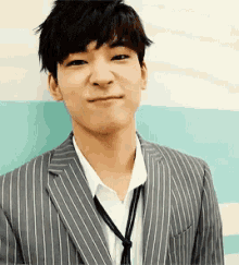 Wonwoo from Seventeen smiles and gestures, wearing a striped suit and tie.