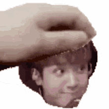 Pixelated hand squeezing Wooseok Pentagon's head in a meme-like image.