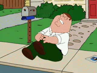 Peter Griffin from Family Guy sits on the sidewalk, clutching his knee in pain after an apparent injury.