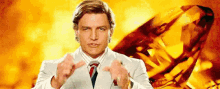 Maxwell Lord from WW84 makes an energetic fist pump gesture with a golden background, appearing on multiple TVs.