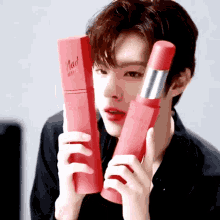 Kim Wooseok holding two pink lipstick tubes, one in its box and one open, looking surprised.