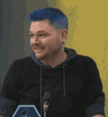 Xander Jeanneret, a man with vibrant blue hair, laughs heartily while sitting in front of a microphone.