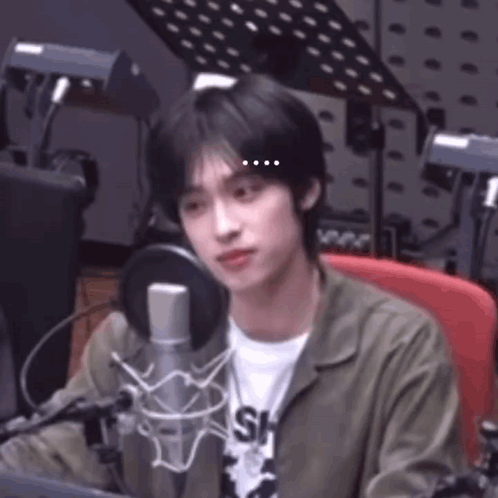 Xdinary Heroes' Gaon looks confused and thoughtful while sitting in a recording studio with a microphone.