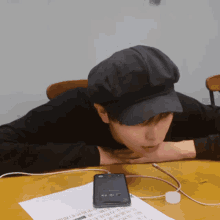 Xiao Yu Liang 肖宇梁, wearing a black hat, looks up from a table and gives a charming nod.