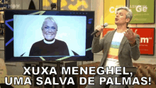 Otaviano Costa calls for a round of applause for Xuxa Meneghel, who appears on a screen, smiling and waving.