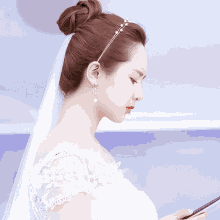 Yangzi, the bride, in a beautiful white wedding dress and veil, looking at her phone with a contemplative expression.