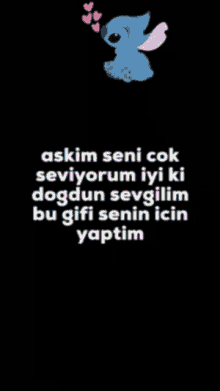 A heartfelt birthday message in Turkish for a loved one, featuring the beloved Disney character Stitch.