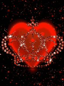 A sparkling red heart adorned with a diamond-like crown on a dark, glittery background.
