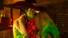 Jeff Daniel Phillips as Herman Munster, in his iconic green fur coat and red hat, enthusiastically shouts 'Yeah!'