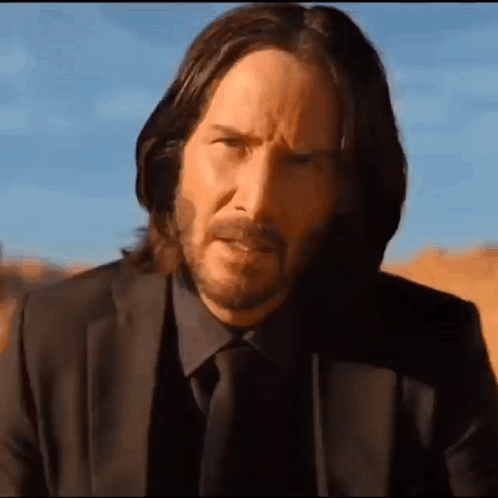 Keanu Reeves as John Wick in a suit, looking intense in the desert, with the caption 'YEAH'.