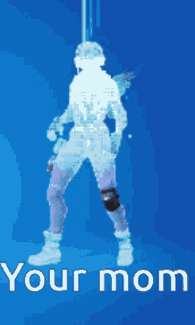 A Fortnite character performs an emote on a blue background with the text 'Your mom' displayed.