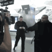Kanye West, wearing a distinctive Yeezy coat, walks through an airport while being filmed by a cameraman.