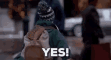 Kevin McCallister from Home Alone 2 enthusiastically says 'YES!' while walking down a city street.