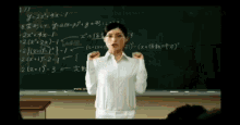 A student watches a surreal teacher in a Japanese classroom with math equations on the blackboard, related to "Yes Milk".