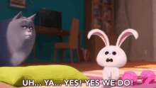 Snowball the rabbit emphatically declares 'Yes! Yes we do!' while Chloe the cat looks on in this scene from Secret Life of Pets.
