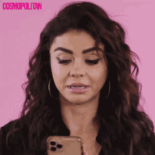 Sarah Hyland reacts with a 'yikes' expression while looking at her phone, featured by Cosmopolitan.