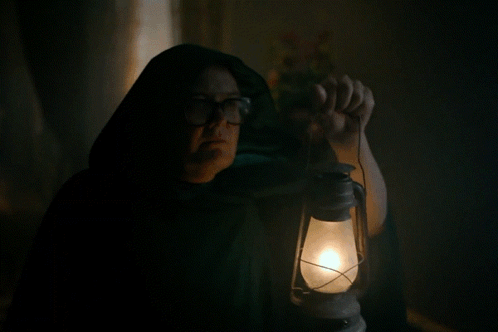 Yolandafister Alan Carr in a green hooded cloak, wearing glasses and holding a lit lantern in a dark setting.