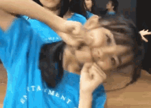 Yori JKT48 makes a playful, cute face, pulling her cheeks while wearing a blue 'Entertainment' t-shirt.