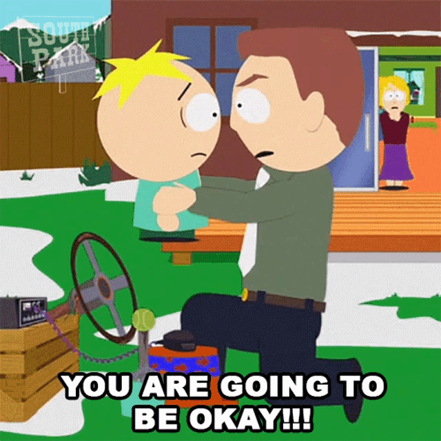 Stephen Stotch comforts Butters Stotch, telling him 'You Are Going To Be Okay' with Linda Stotch in the background.
