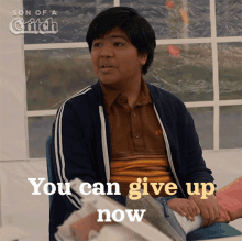 Ritche from Son of a Critch delivers the line 'You can give up now' with a confident smirk.