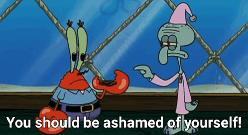 Squidward, in pajamas, tells Mr. Krabs, "You should be ashamed of yourself!" in Spongebob Squarepants.