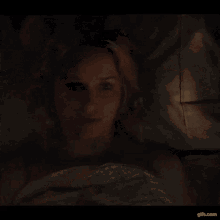 Elizabeth Lail as Beck, lying in bed with Penn Badgley as Joe Goldberg, looking concerned in the You Show.